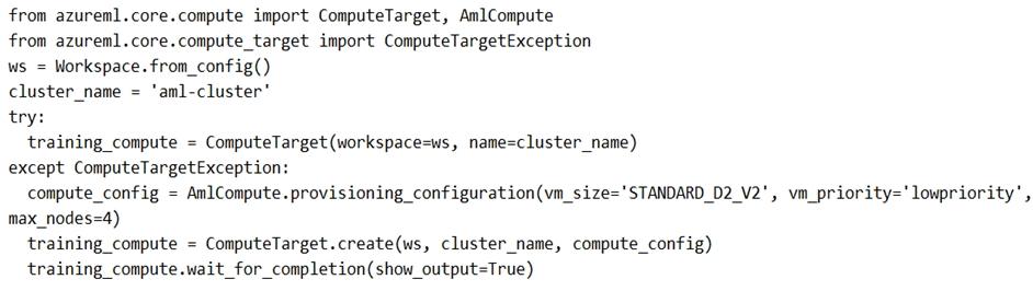 You are preparing to use the Azure ML SDK to run an experiment and need to create compute. You run the following code: