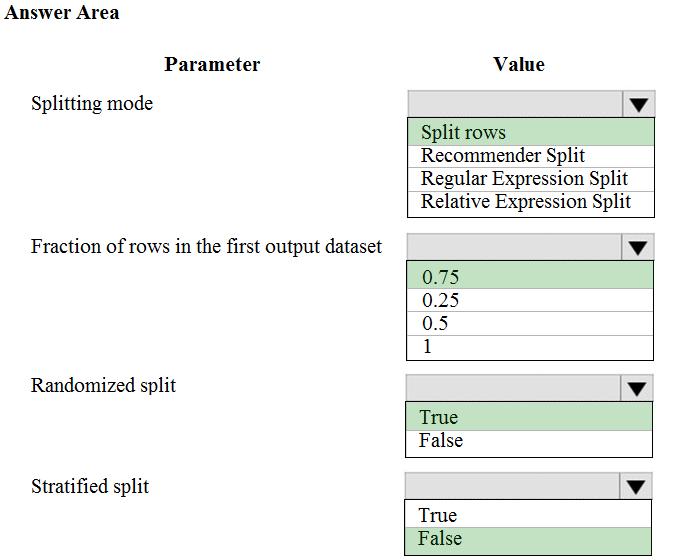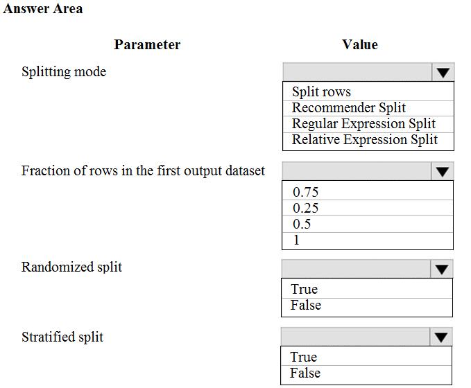 You have a dataset that contains 2,000 rows. You are building a machine learning classification model by using Azure Learning Studio. You add a Partition and