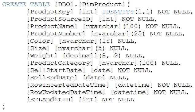 You are creating dimensions for a data warehouse in an Azure Synapse Analytics dedicated SQL pool. You create a table by using the Transact-SQL statement shown in the following exhibit.