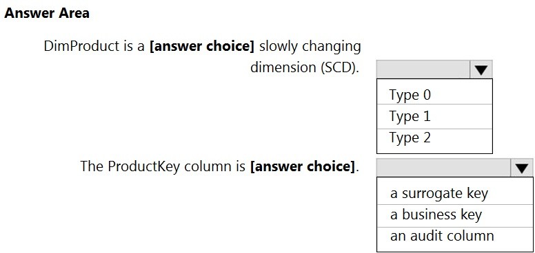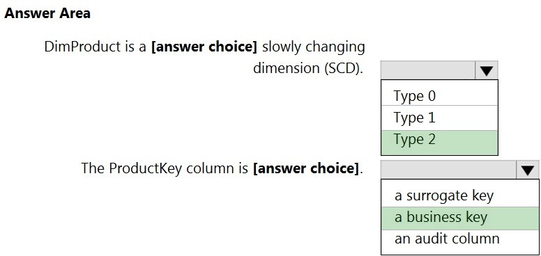 A Type 2 SCD supports versioning of dimension members. Often the source system doesn't store versions, so the data warehouse load process detects and manages changes in a dimension table. In this case, the dimension table must use a surrogate key to provide a unique reference to a version of the dimension member. It also includes columns that define the date range validity of the version (for example, StartDate and EndDate) and possibly a flag column (for example, IsCurrent) to easily filter by current dimension members.