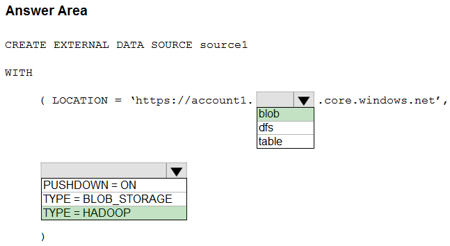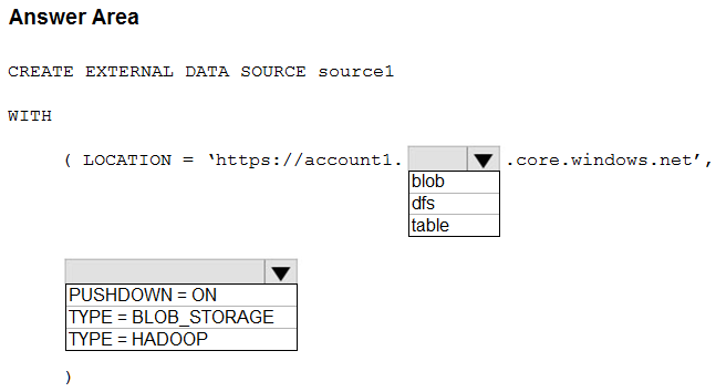 You need to create a data source in Pool1 that you can reference when you create the external table. How should you complete the Transact-SQL statement? To answer, select the appropriate options in the answer area.