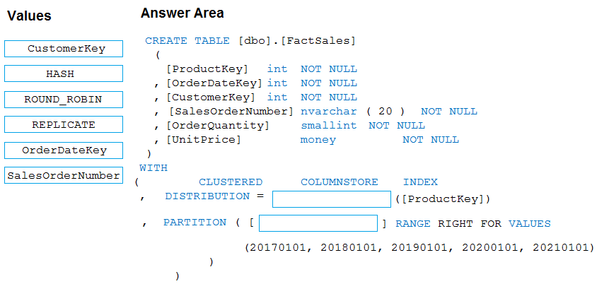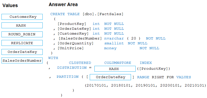 Data in the table will be retained for five years. Once a year, data that is older than five years will be deleted. You need to ensure that the data is distributed evenly across partitions. The solution must minimize the amount of time required to delete old data.