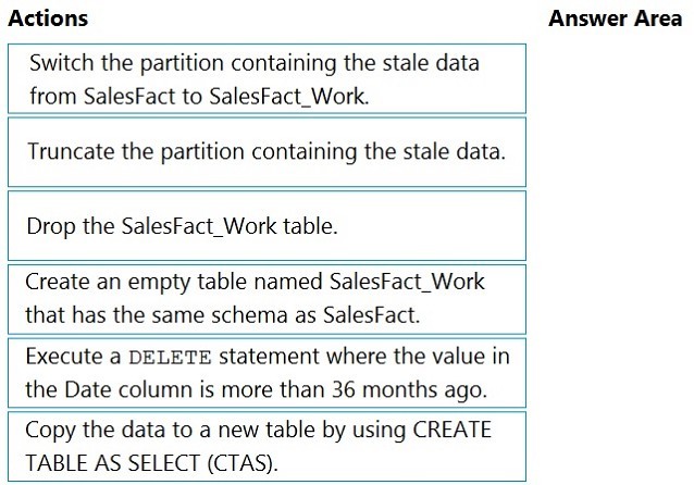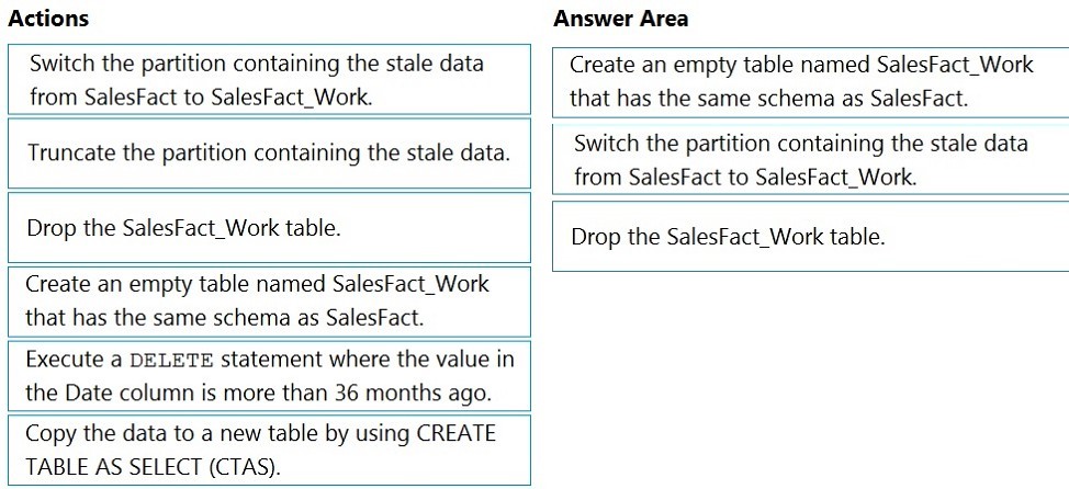 Step 1: Create an empty table named SalesFact_work that has the same schema as SalesFact. Step 2: Switch the partition containing the stale data from SalesFact to SalesFact_Work.