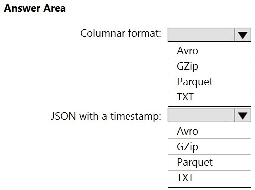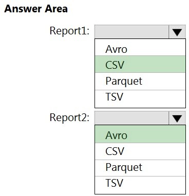 You need to recommend in which format to store the data in the data lake to support the reports. The solution must minimize read times. What should you recommend for each report? To answer, select the appropriate options in the answer area.