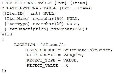 Using PolyBase, you create an external table named [Ext].[Items] to query Parquet files stored in Azure Data Lake Storage Gen2 without importing the data to the data warehouse.