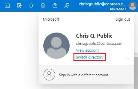 Step 1: In the Azure portal, in the upper-right corner select your account, and then choose Switch directories to confirm which directory is your Current directory. Switch directories, if necessary.