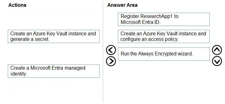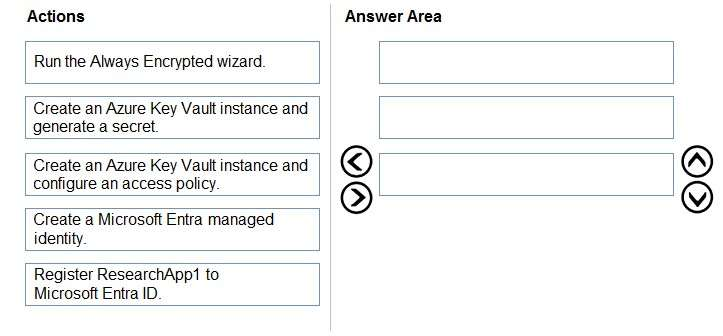 Box 2: Create an Azure Key Vault instance and configure an access policy. Need to configure the key vault with an access policy to enable ResearchApp1 retrieval of the keys.