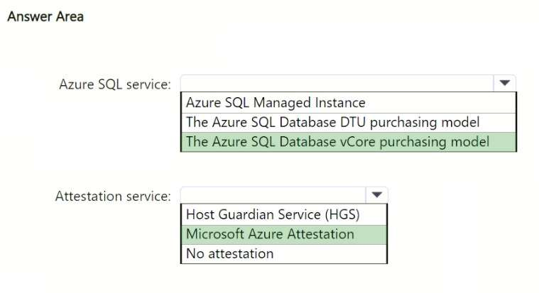 Which Azure SQL service and attestation service should you include in the solution? To answer, select the appropriate options in the answer area.