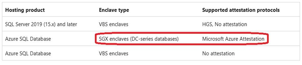 The below table captures the supported attestation protocols for the valid SQL product and enclave type combinations:
