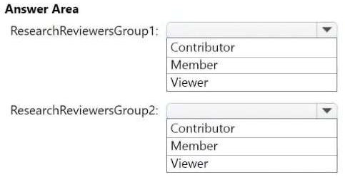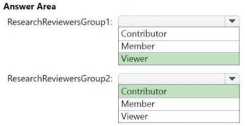 Which workspace role assignments should you recommend for ResearchReviewersGroup1 and ResearchReviewersGroup2? To answer, select the appropriate options in the answer area.