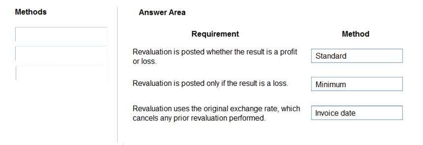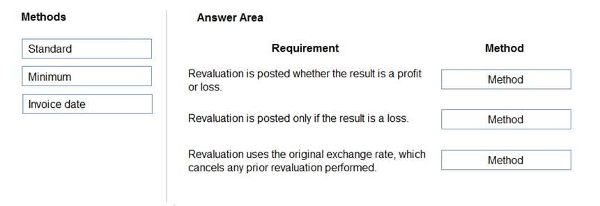 Which currency revaluation method should you use for each requirement? To answer, drag the appropriate methods to the correct requirements. Each method may be used once, more than once, or not at all. You may need to drag the split bar between panes or scroll to view content.