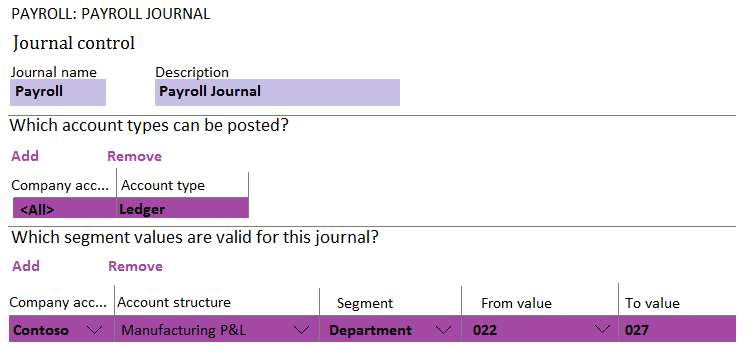 1. Use journal control to specify which account types are valid for the General ledger journal.