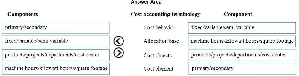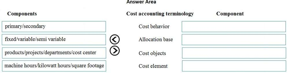 To answer, drag the appropriate component to the correct cost accounting terminology. Each source may be used once. You may need to drag the split bar between panes or scroll to view content.