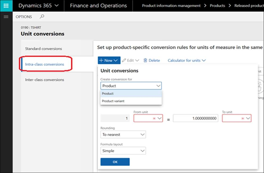 4. Enable unit of measure conversions in the product master. Configure the intra-class unit conversion feature in the released products.