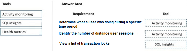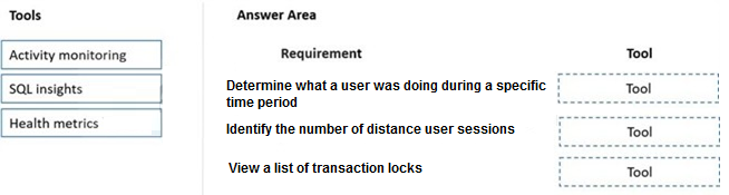 Which tool should you use? To answer, drag the appropriate tools to the correct requirements. Each tool may be used once, more than once, or not at all. You may need to drag the split bar between panes or scroll to view content.