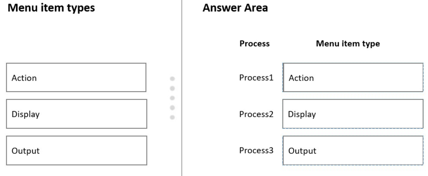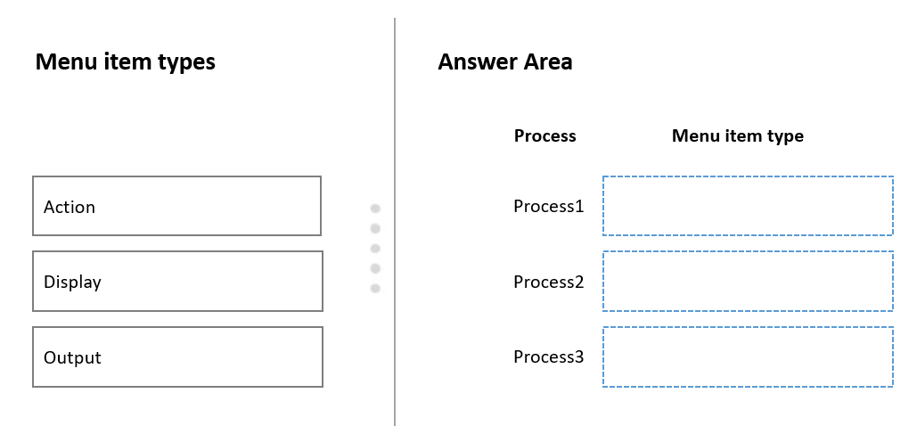 Which menu item types should you use? To answer, drag the appropriate menu item types to the correct processes. Each menu item type may be used once, more than once, or not at all. You may need to drag the split bar between panes or scroll to view content.