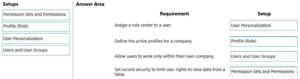 Which setup should you use? To answer, drag the appropriate setups to the correct requirements. Each setup may be used once, more than once, or not at all. You may need to drag the split bar between panes or scroll to view content.