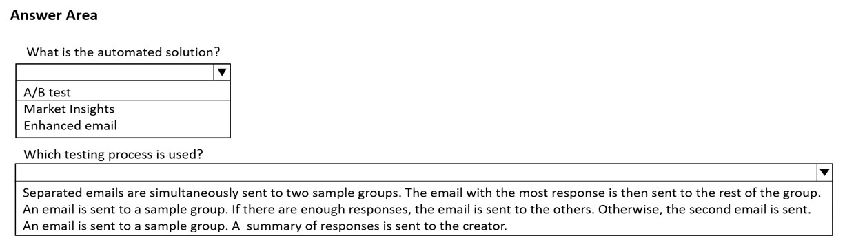 A company uses Dynamics 365 Marketing. The company wants an automated solution to test two email designs before launching the entire email campaign.