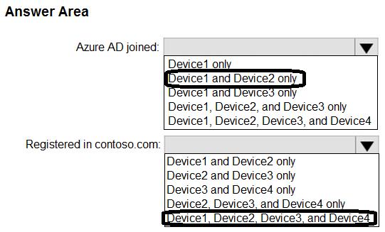 Which devices can be Azure AD joined, and which devices can be registered in contoso.com? To answer, select the appropriate options in the answer area.