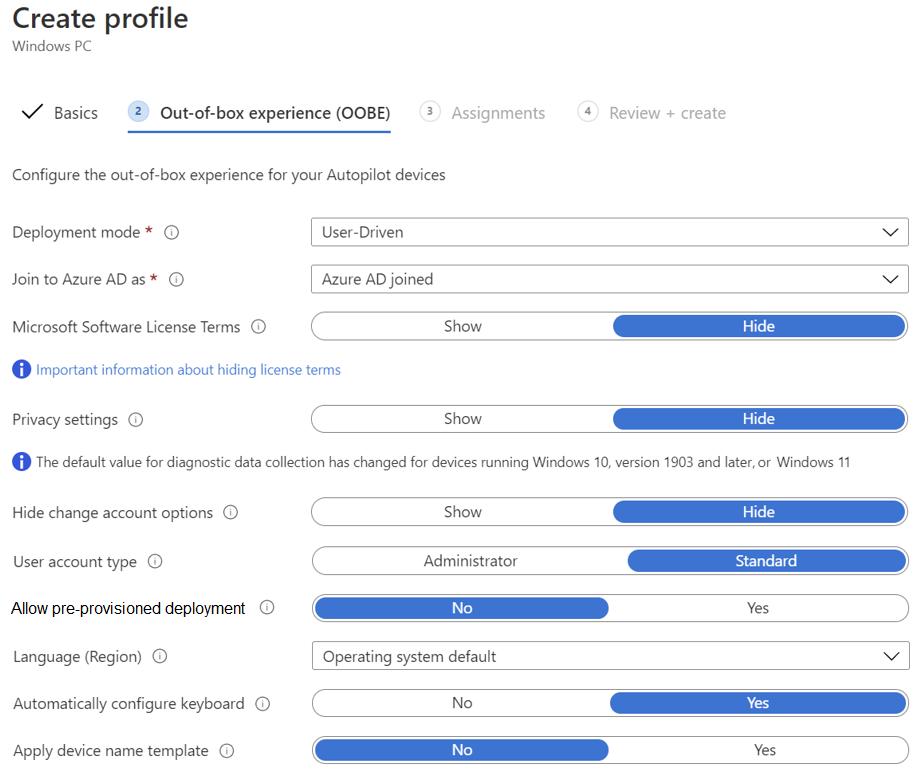 You are creating a Windows Autopilot deployment profile named Profile1 as shown in the following exhibit. Profile1 will be deployed to Windows 10 devices.