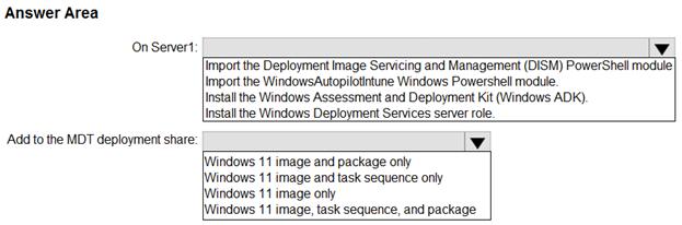 What should you do on Server1, and what are the minimum components you should add to the MDT deployment share? To answer, select the appropriate options in the answer area.