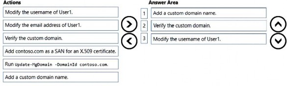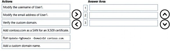When you have added and verified the domain, you can configure the user accounts to use it. To configure User1 to sign in as user1@contoso.com, you need to change the username of User1. In Office 365, the username is composed of two parts. The first part is the actual username (User1) and the second part is the domain. You need to modify the username of User1 by selecting the contoso.com domain from the dropdown list of domains. The dropdown list of domains contains the <domain>.onmicrosoft.com domain and any custom domains that have been added.