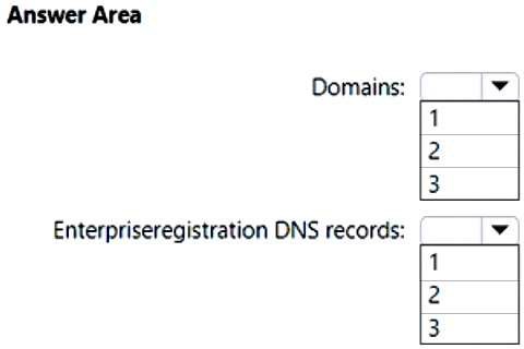How many domains should you verify, and what is the minimum number of enterpriseregistration DNS records you should add? To answer, select the appropriate options in the answer area.