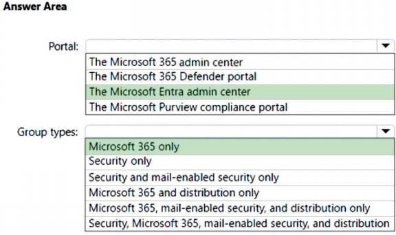 Which portal should you use, and to which types of groups will the policy apply? To answer, select the appropriate options in the answer area.