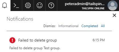 When trying to delete a group in the portal, you may see an error notification like this: