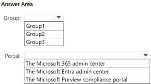 To which group should you add the users, and which portal should you use to assign the license? To answer, select the appropriate options in the answer area.