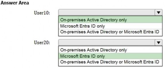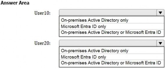 You create a new user named User10 on-premises and a new user named User20 in Microsoft Entra ID. You need to identify where an administrator can reset the password of each new user.