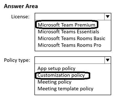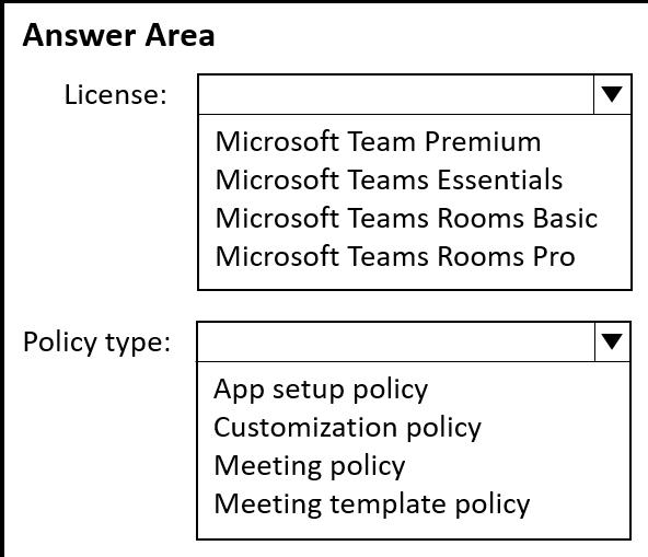 Which license should you acquire, and which type of policy should you configure in the Microsoft Teams admin center? To answer, select the appropriate options in the answer area.