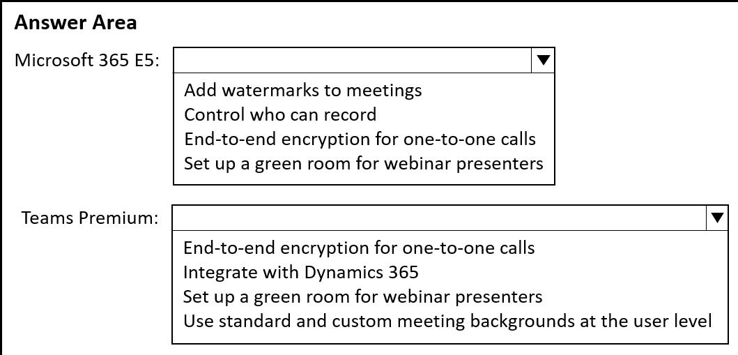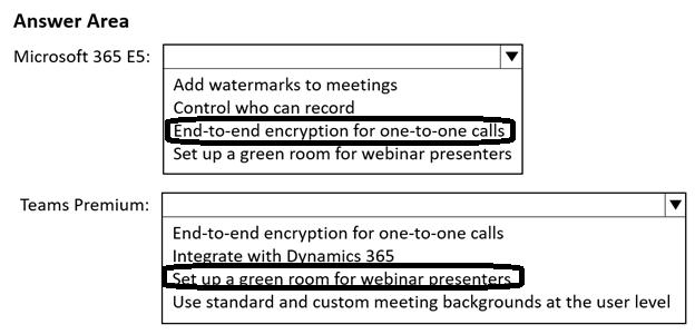 Which feature is included in Microsoft 365 E5, and which feature is exclusive with Teams Premium? To answer, select the appropriate options in the answer area.