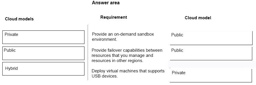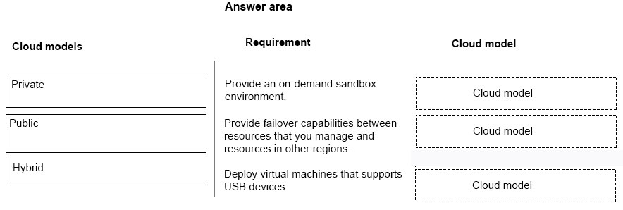 Which cloud models should you use? To answer, drag the appropriate cloud models to the correct requirements. Each cloud model may be used once, more than once, or not at all. You may need to drag the split bar between panes or scroll to view content.