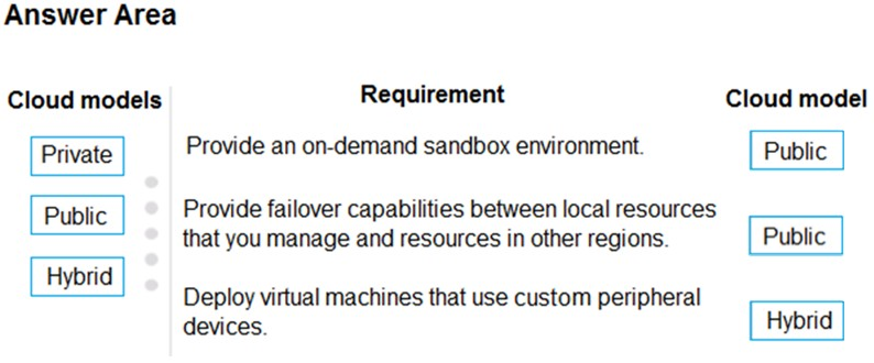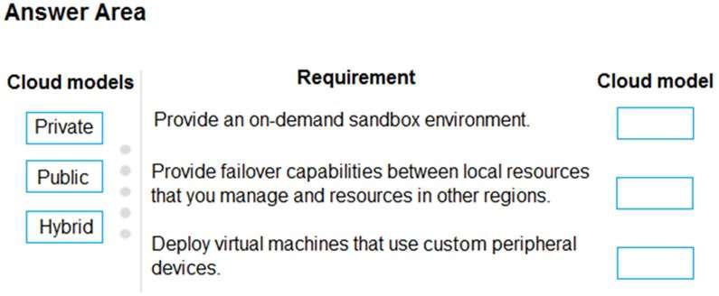 Which cloud models should you use? To answer, drag the appropriate cloud models to the correct requirements. Each cloud model may be used once, more than once, or not at all. You may need to drag the split bar between panes or scroll to view content.
