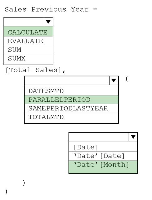 Syntax: PARALLELPERIOD(<dates>,<number_of_intervals>,<interval>) dates: A column that contains dates. interval: The interval by which to shift the dates. The value for interval can be one of the following: year, quarter, month.