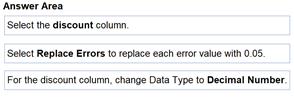 You need to clean and transform the query so that all the rows of data are maintained, and error values in the discount column are replaced with a discount of 0.05. The solution must minimize administrative effort.