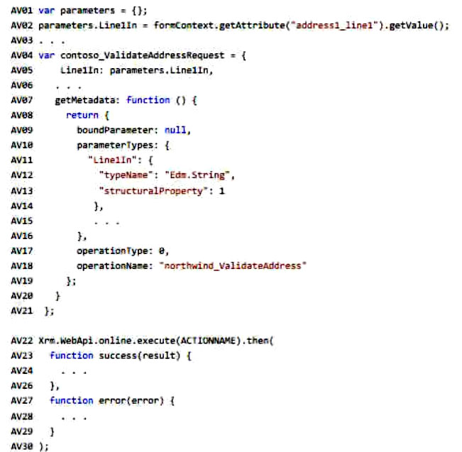 You create a custom action to communicate with the address verification API by using the following code. (Line numbers are included for reference only.)