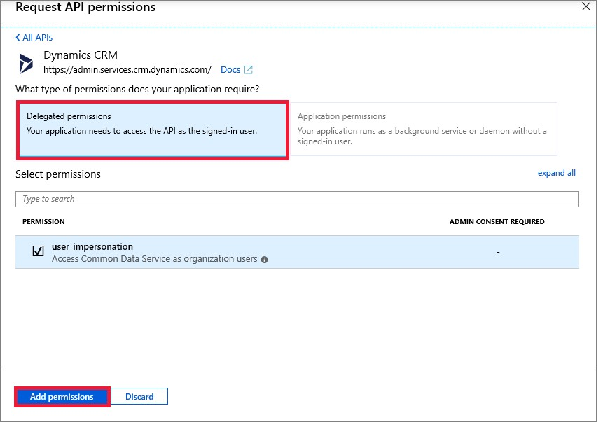 5. Grant the application delegated permissions to the Dynamics CRM API in Azure Active Directory.