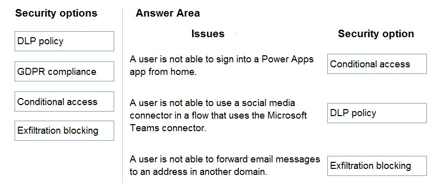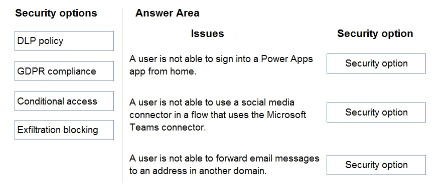 https://docs.microsoft.com/en-us/power-platform/admin/restrict-access-online-trusted-ip-rules https://docs.microsoft.com/en-us/power-platform/admin/wp-data-loss-prevention https://docs.microsoft.com/en-us/power-platform/admin/block-forwarded-email-from-power-automate