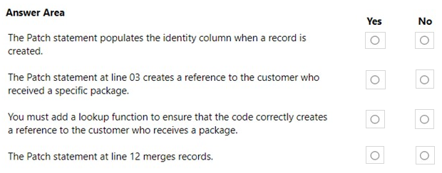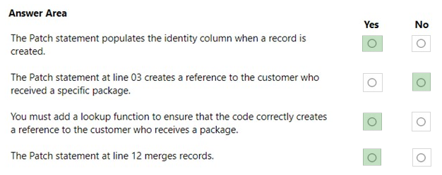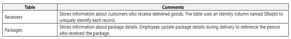 A delivery service uses a canvas app to track and deliver packages. The app uses SQL Server as a data store. The database includes the following tables: