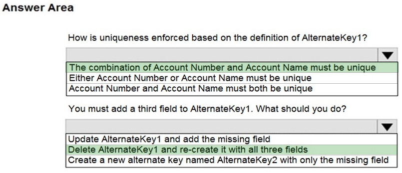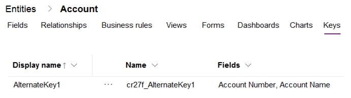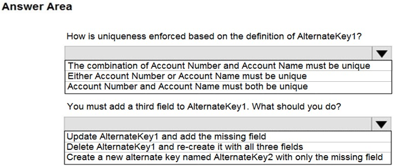 You create an alternate key named AlternateKey1 on the Account entity. The definition for AlternateKey1 is shown in the following exhibit: