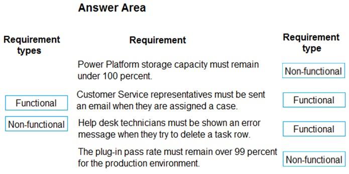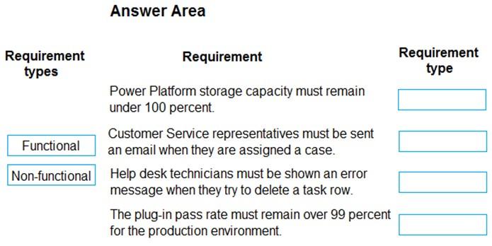 Which requirement type should you use? To answer, drag the appropriate requirement types to the correct requirements. Each requirement type may be used once, more than once, or not at all. You may need to drag the split bar between panes or scroll to view content.