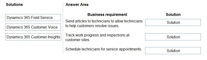 What should you recommend? To answer, drag the appropriate solutions to the correct business requirements. Each solution may be used once, more than once, or not at all. You may need to drag the split bar between panes or scroll to view content.