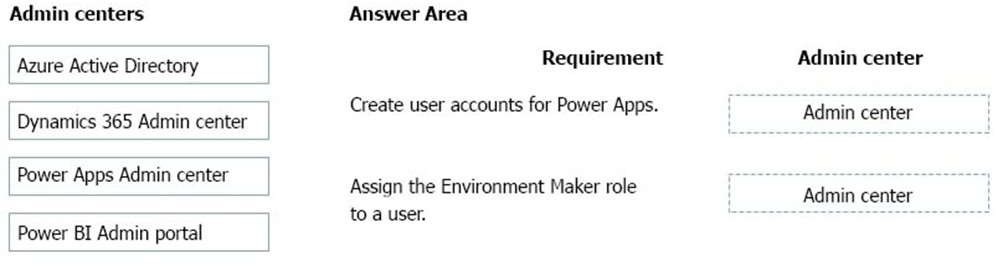 Which admin centers should you use? To answer, drag the appropriate admin centers to the correct requirements. Each admin center may be used once, more than once, or not at all. You may need to drag the split bar between panes or scroll to view content.