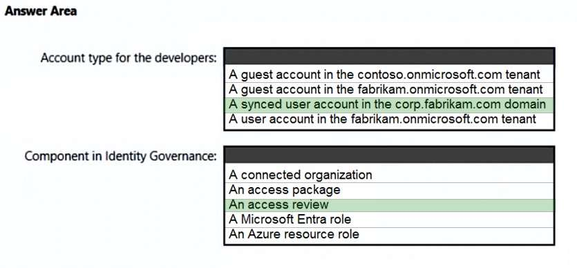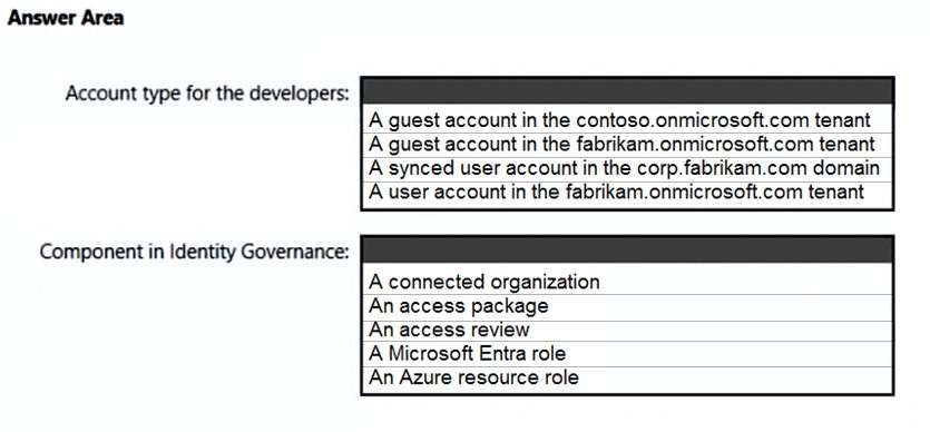 Note: Developers at Contoso will connect to the resources of Fabrikam to test or update applications. The developers will be added to a security group named ContosoDevelopers in fabrikam.onmicrosoft.com that will be assigned to roles in Sub1.