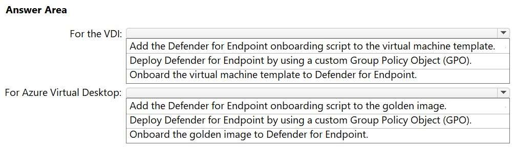 Box 1: Add the Defender for Endpoint onboarding script to the virtual machine template. Ensure that the Microsoft Defender portal contains a single entry for each deployed VDI host.