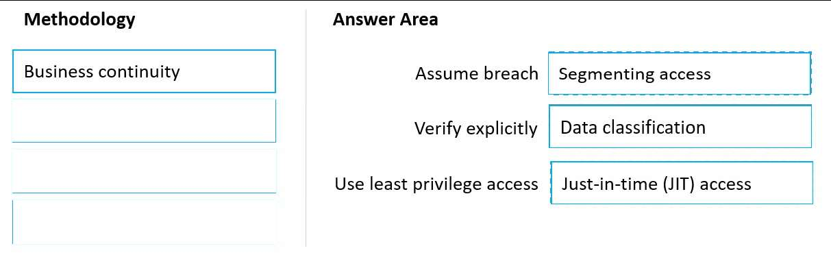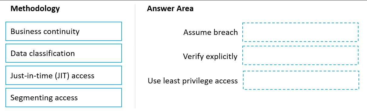 Which security methodologies should you include in the recommendation? To answer, drag the appropriate methodologies to the correct principles. Each methodology may be used once, more than once, or not at all. You may need to drag the split bar between panes or scroll to view content.