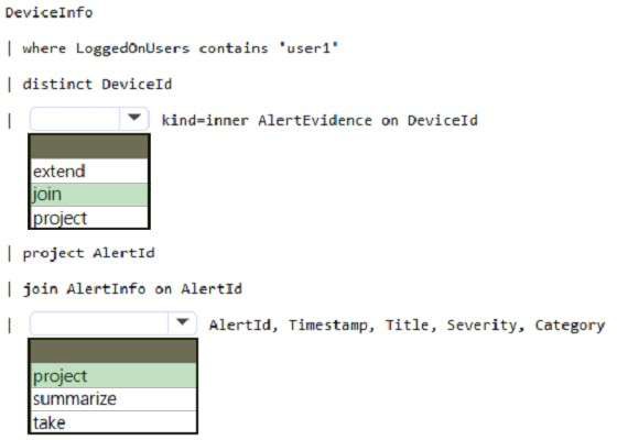 DeviceInfo LoggedOnUsers AlertEvidence "project AlertID" Box 2: project