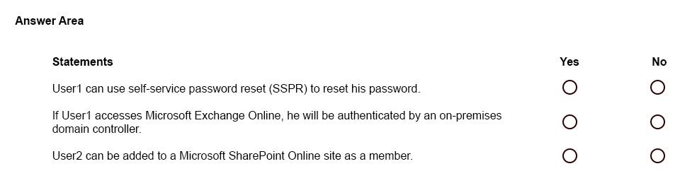 Your network contains an on-premises Active Directory Domain Services (AD DS) domain that syncs with Azure AD and contains the users shown in the following table.